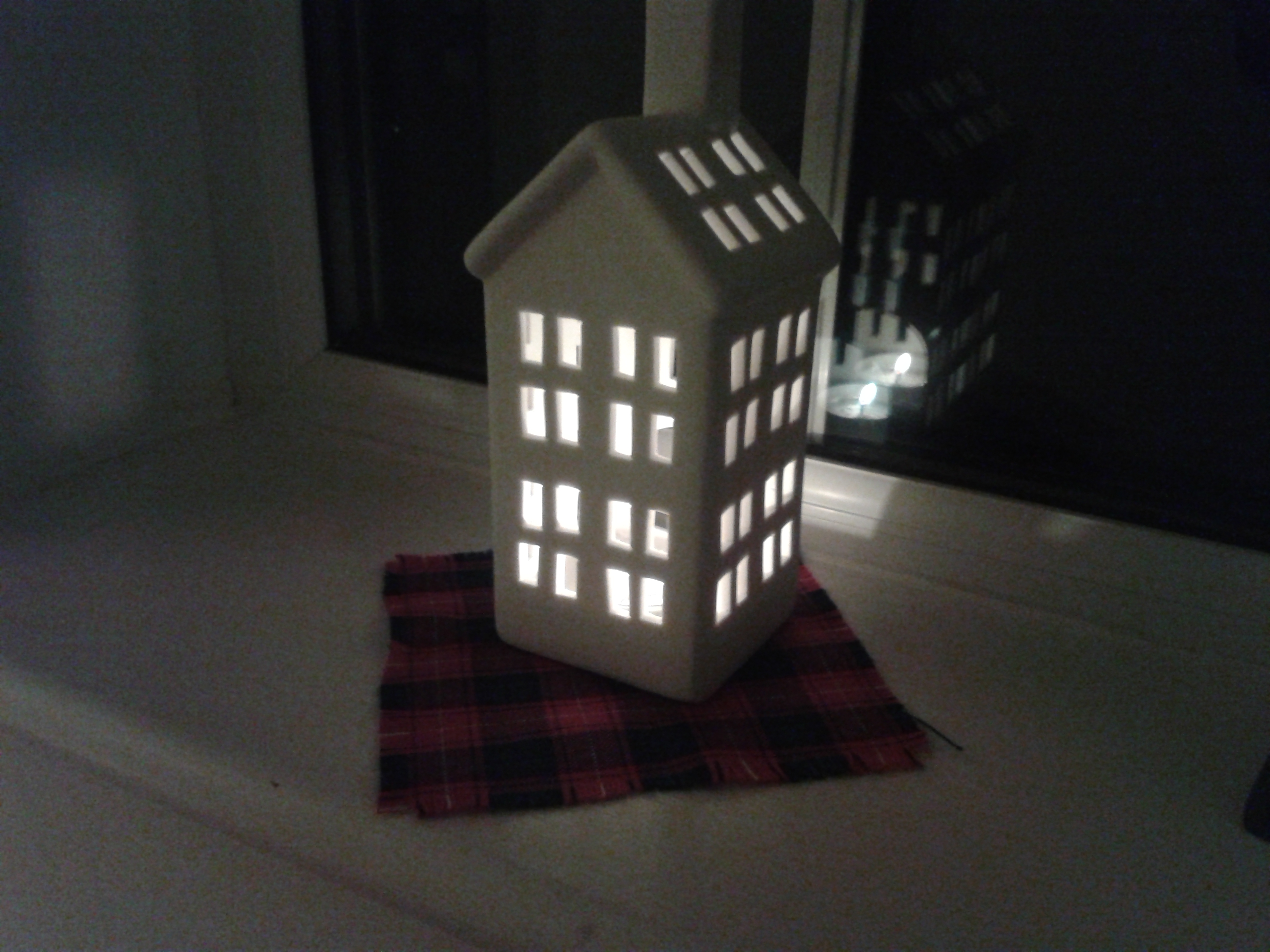 My favourite present this Christmas so far, is a little painted house bought by my daughter. It’s tall and narrow and covered with tiny windows. I’ve put it half way along the passage that leads from the front to the back of our house and I keep walking past, and loving it. An odd choice for a favourite perhaps, when compared to money and perfume and books, which I also love by the way. But the house is special, because at the back, there’s space for a candle and when you light it and turn it round, it looks magical. With the blind up and the night behind. Like a beacon. A strip of stone leaking light into darkness.