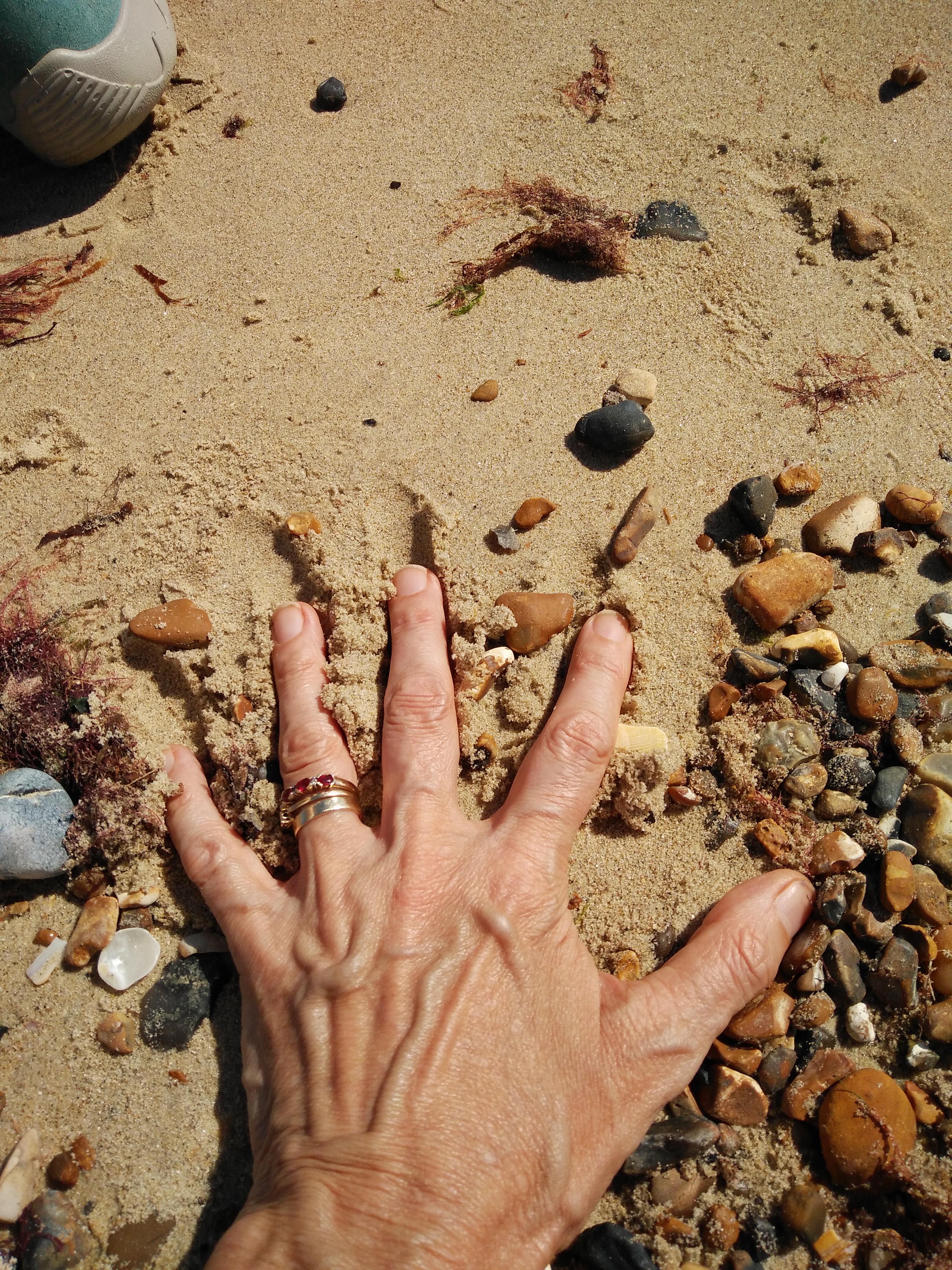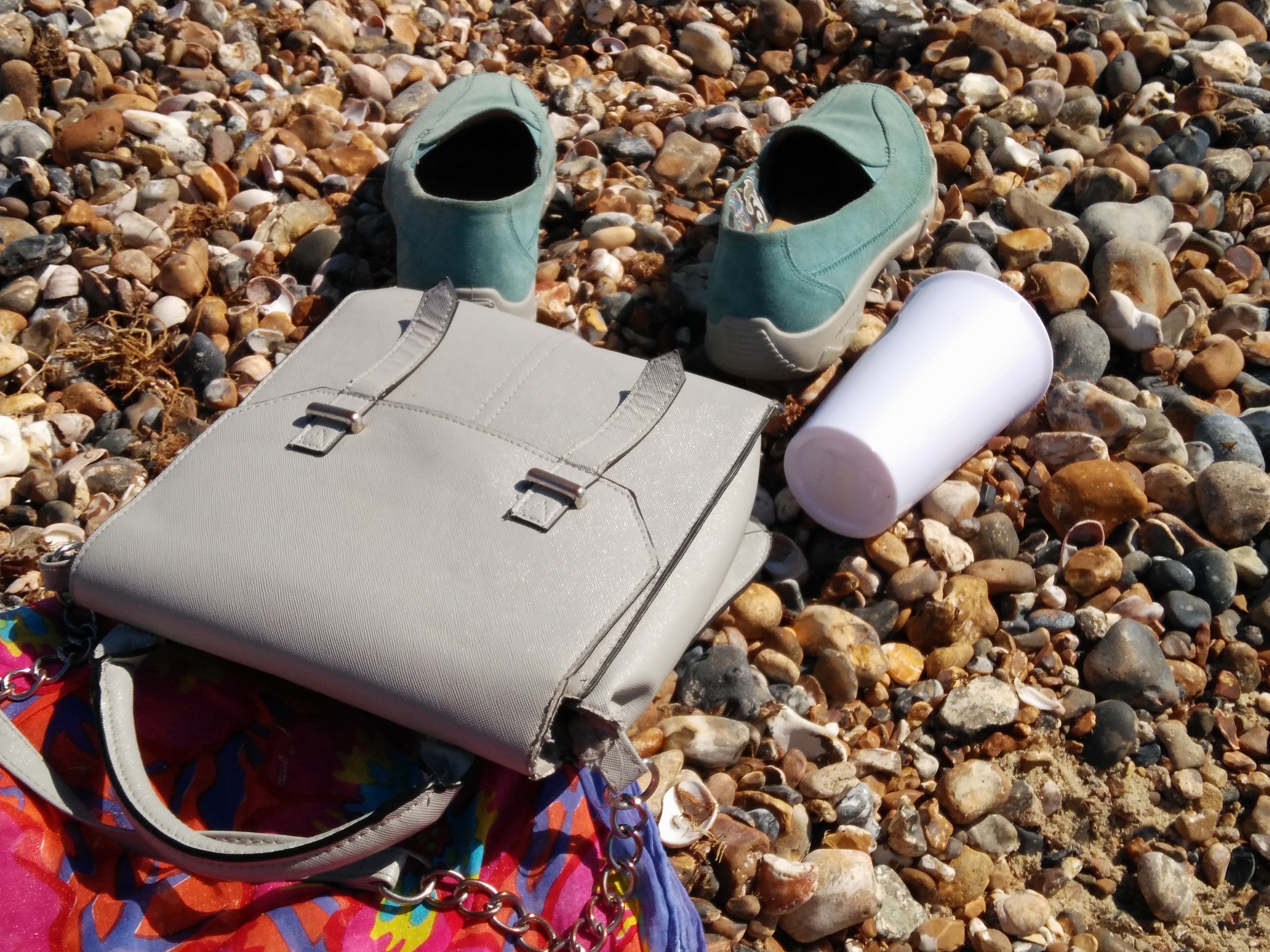 The beach was half empty. The sun was steady, the water glistened. We sat above a tide mark of salt-crust seaweed, determined to store up gold for winter. Lying down, we literally sucked sunshine from the sky until we were plump and gasping. Then we had a cup of tea.
