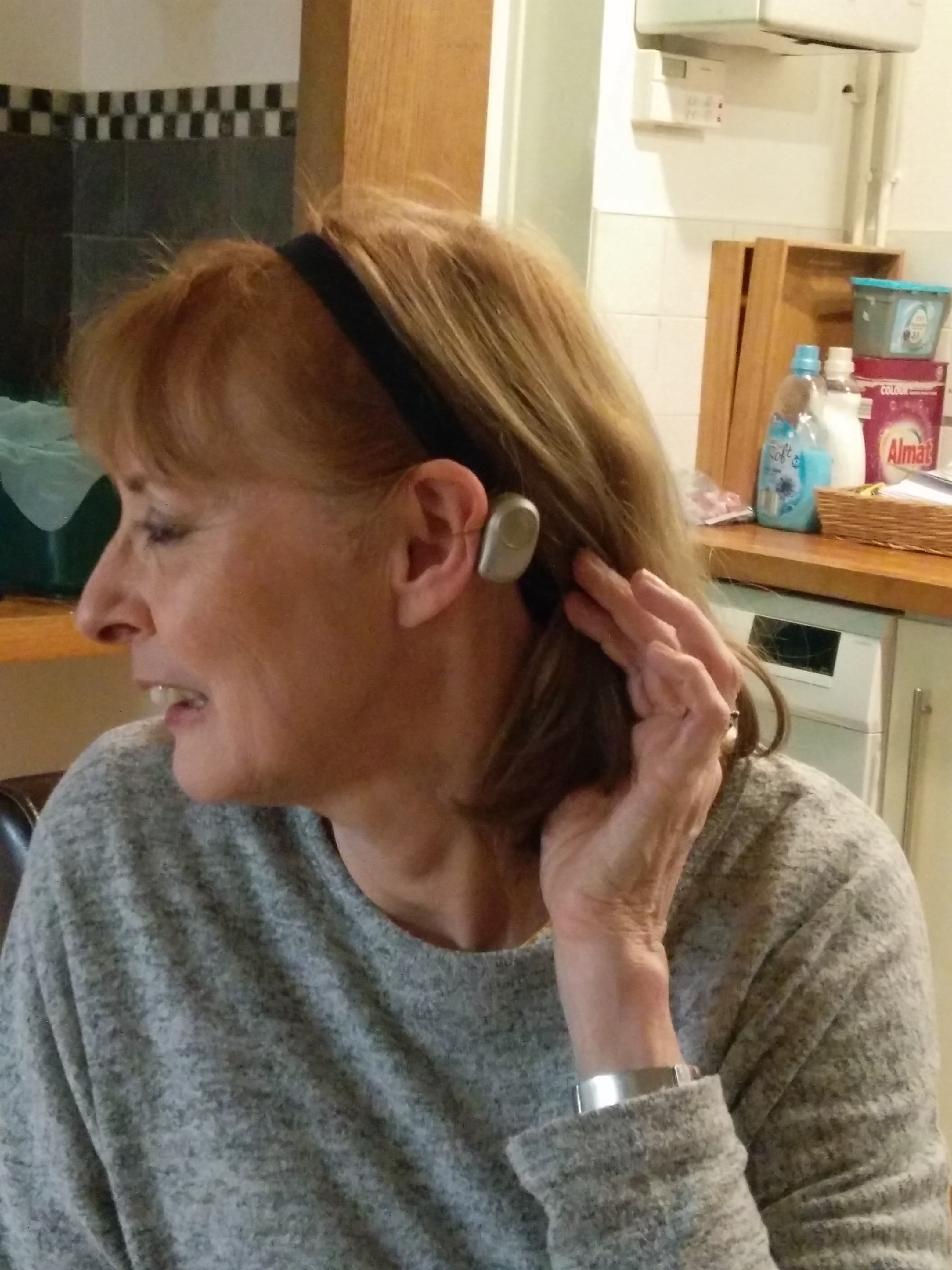 I trialled bone-implanted hearing aids on a special hairband. Now they are clipped on metal screws embedded in my skull. Nice.
