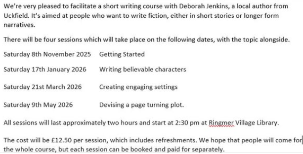 If you’re in Sussex and are interested in writing workshops, I’m running some at Ringmer Library over the next few months. Programme below. Please email Liz at ringmervillagelibrary@gmail.com if you’d like to book a place. Details below: